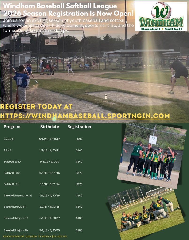 Windham Baseball and Softball League (WBSL) is not for profit, volunteer run organization based in Windham, NH committed to providing a good experience for all players to learn and develop in baseball and softball. WBSL has a Spring Rec season that runs from April through early June, summer season offerings consisting of Tournament Teams and second season programs and various skills and drills sessions.